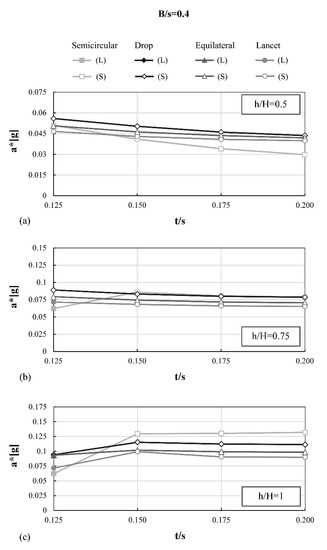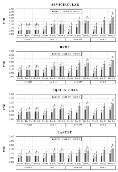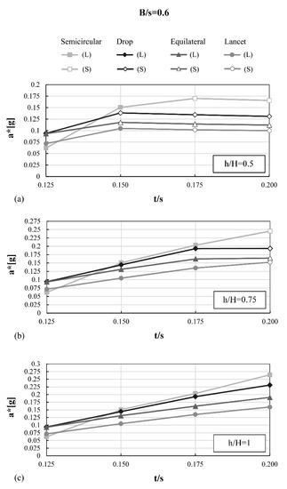 In Figure 12, Figure 13 and Figure 14 the seismic capacity of the unreinforced arches is expressed in terms of peak ground acceleration a* by dividing the force multiplier λ by the participating mass ratio. The obtained a* values are displayed against the t/s ratio and presented following the B/s and h/H ratios. In addition, local (L) or semi-global (S) and global (G) mechanisms are highlighted.