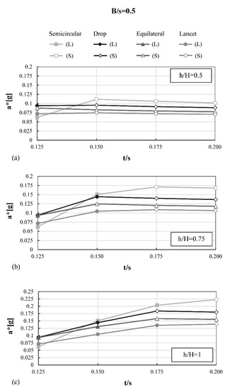 Intuitively, the influence of the thickness of the arch is positively related to the collapse acceleration when the collapse is local (see for instance B/s = 0.6 and h/H = 1.0), meaning that an increase of thickness is beneficial to the system lateral capacity. Conversely, in case of semi-global collapse type, this trend is not visible and may be even opposite (e.g., B/s = 0.4 and h/H = 0.5). The very low acceleration (0.05–0.06 g) observed for the semicircular arch in all configurations for the lowest thickness value t/s = 0.125 derives from the choice of a lower bound slightly higher than the minimum thickness necessary to withstand the arch self-weight (t/s = 1/9).