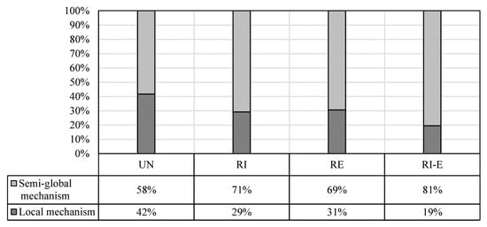 Percentage of activation of Local or Semi-global mechanisms in (UN), (RI), (RE) and (RI-E) buttressed arches.