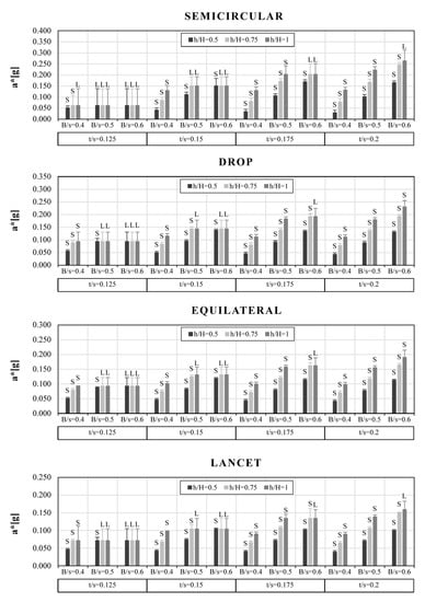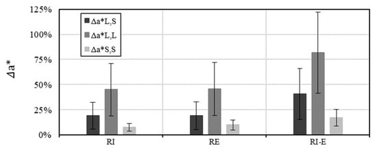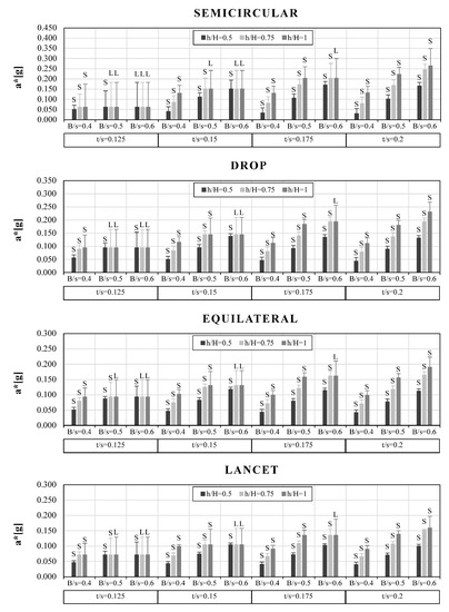 The results obtained, for each eccentricity and reinforcement configuration (RI, RE and RI-E), are depicted in Figure 17, Figure 18 and Figure 19, in terms of increase of the a* values (thin lines) with respect to the unreinforced (UN) configuration (bars). The a* values are presented following the t/s, B/s and h/H ratios and L- or S-mechanisms in the reinforced configuration are highlighted.