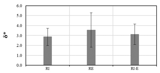 According to Equation (6), it is possible to define a dimensionless ductility of the buttressed arch as the ratio between the horizontal key displacement when mortar reaches its ductility limit and mortar capacity . In Figure 21, the average and standard deviation for , which identify the ductility of (RI), (RE) and (RI-E) buttressed arches, are depicted. The contribution of the mortar seems more convenient in the case of (RE) buttressed arches. This ductility reserve together with increase in acceleration at collapse can be exploited for seismic retrofitting of buttressed arches.