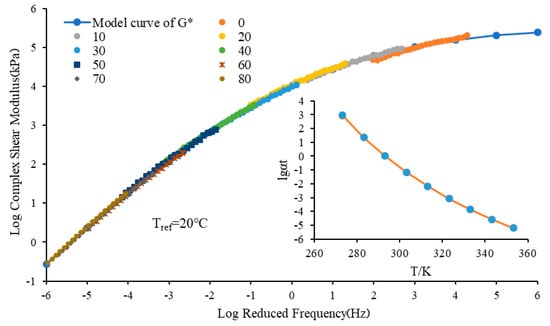 The main modulus curve could be obtained by translating the modulus curves at different temperatures through the time–temperature displacement factor to the modulus curve at the reference temperature. The effect of temperature on the complex modulus was only to shift the modulus curve at different temperatures, with its shape remaining unchanged. According to the time–temperature equivalence principle, the influence of temperature and frequency (loading time) on asphalt material could be transformed into the effect of reduced frequency through time–temperature displacement factor. The reduced frequency was obtained from Formula (2):