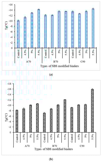 The glass transition temperatures of the three asphalt sources, with the addition of 5% SBS for different aging states, are shown Figure 8. The glass transition temperature of the modified asphalt in unaged, RTFO and PAV state rose with the increase in aging degree. At the same time, for the same source of asphalt in the B70 and C90 binders, the glass transition temperature at the same degree of aging decreased with the increase in grade.