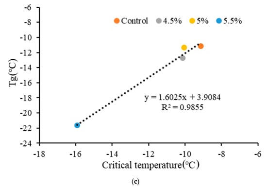 In order to further illustrate the relationship between critical temperature and the of SBS asphalt modified with different asphalt sources, the SBS asphalt modified with different asphalt sources should be analyzed. It can be seen from Figure 7 that the correlation coefficient, between the critical temperature and of the three kinds of SBS modified asphalt, was 0.93, which is greater than 0.632 (the confidence degree is 95%, and the degree of freedom was 10), indicating that there was a significant correlation between the critical temperature and of the three kinds of SBS modified asphalt. Moreover, it could be seen intuitively that the low temperature performance of the C90 SBS modified asphalt was better than that of A70 and B70 SBS modified asphalt. It can be seen from Figure 7b that, with the increase of SBS content, the critical temperature and of the SBS modified asphalt obviously decreased. Therefore, the influence of the SBS content on its low temperature performance was very significant, and the SBS asphalt modified by adding 5.5% of SBS content had the best low temperature performance. As the glass transition temperature had a clearly physical significance, it could characterize the difference in low-temperature performance between different asphalt sources and different SBS contents, and the evaluation results had a significant correlation with the critical temperature of the low temperature creep of the SBS modified asphalts (the confidence level is 95%). As a result, the data obtained by DSR experiments to calculate the glass transition temperature could be evaluated for the low temperature properties of the SBS modified asphalts. The method could not only reduce the workload of low temperature performance tests, it also provided strong and complementary evidence to evaluate the low temperature performance of asphalt materials.