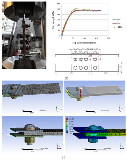 FEM simulation of bolt slippage; (a) model validation, (b) FEM simulation.