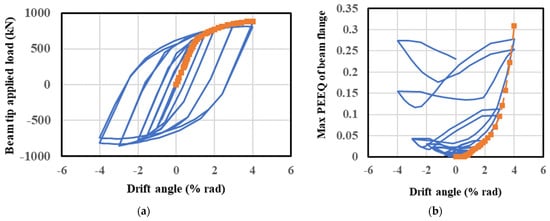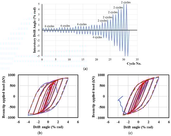 Figure 3a,b shows the predicted load-displacement responses for the two steel connections and compares them to the experimental responses. For reference, the AISC loading protocol is depicted as well. The connection models were validated by the results of two full-scale tests []. Displacements were applied 4.125 m from the column face at the beam tip under the 2016 AISC seismic condition [].