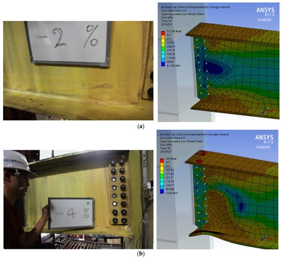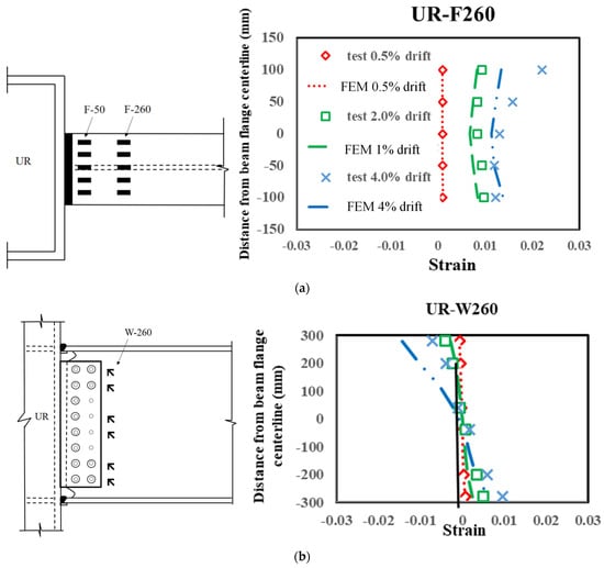 Figure 5 depicts the measured and simulated strain for different drifts. The strain gauges F260 and W260 were attached on the beam flanges and were 260 mm away from the column face. As illustrated by Figure 5a, the uniaxial strain gauges F260 were attached symmetrically from the central line of the beam flange. As can be seen in Figure 5b, the triaxial stain gauges W260 were attached outsides the shear tab and in the same lines of high-strength bolts.