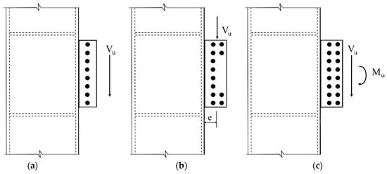 Figure 6 explains the design consideration of bolted web connection in the U.S., Taiwan and Japan. For the ease of fabrication, the U.S. direct welded flange connection adopts a shear tab or web plate and high-strength bolts in Figure 6a. The beam flanges are designed to carry all the beam moment, and the shear tab is designed to transfer shear without considering any eccentricity moment []. The shear strength of high-strength bolts were used in the strength evaluation. The development of structural design standards and seismic provisions in Taiwan basically follow those of the U.S. high-strength bolts and were observed to slip early in the cyclic loading tests of steel moment connections with BWWF details (e.g., [,]). The perceptions about bolt slippage and the probably devastating effects [,,] have caused the structural engineers in Taiwan to improve the design practice. The bolted web connections were designed, using the slip strength of high-strength bolts and considering the eccentricity moment in Figure 6b. In Japan, a beam web is designed to take moment with the beam flanges. The 2012 AIJ connection design recommendations [] suggest that the high-strength bolts of a bolted web connection be designed to take the shear and moment in Figure 6c. The shear strength of high-strength bolts were used in the strength evaluation.