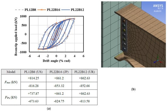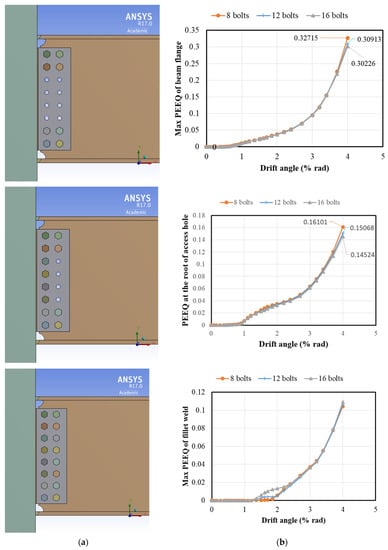 Figure 9 depicts and compares the values of PEEQ index for three different bolt arrangements and strength. There are three cases in the FEM simulation, as shown in Figure 9a. As mentioned, the UR-connection was designed in accordance with the post-earthquake design practice in Taiwan. The connection uses a total of 12 M24-S10T high-strength bolts with a 22-mm thick shear tab. This 12-bolts case took into account the bolt slip strength, eccentric moment and shear demand of the bolted web connection. The other two cases considered the shear strength of high strength bolts. In detail, the 8-bolts case considered the shear demand only, and the 16-bolts case considered both the shear and moment demands.