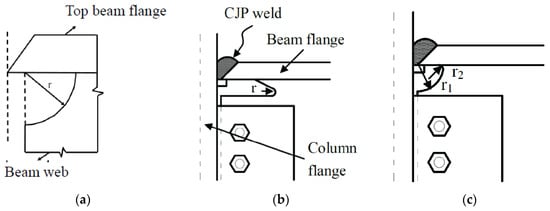 Figure 10 shows the shapes of the weld access holes. For the ease of welding, a 1/4-circle cut was created with a radius (r) at the corner of a beam web, as shown in Figure 10a. Such a conventional weld access hole was thought to cause stress concentration, leading to fracture failures of the steel moment connections with BWWF details. After the earthquakes, special seismic weld access holes were developed with requirements in size, shape, and finish [,]. As illustrated by Figure 10b,c, the improved weld access holes provide a smoother transition to reduce the stress concentration, and the larger openings make it easier to access and inspect welds.