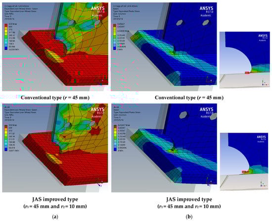 Figure 11 depicts and compares the values of the PEEQ index for conventional and improved weld access holes. Under the 2016 AISC seismic condition, the UR-connection was tested and sustained a drift of 4% before ductile fracture occurred in base metal surrounding the beam-flange groove weld. The improved weld access holes of the tested connections were created using two different radii (i.e., r1 = 45 mm and r2 = 10 mm). In the FEM simulation, the weld access holes of the connection were changed to be conventional ones with a radius (i.e., r = 45 mm). The two types of weld access holes gave a very similar distribution of von Mises stresses in Figure 11a. The von Mises stresses near the weld access holes were analyzed and compared at the 4% drift. In detail, the stress at the root of the access hole did not reduce but increased for the improved weld access hole. The stress concentration in the region near the access hole also did not reduce. The two types of weld access holes also gave very similar distribution of the PEEQ index values in Figure 11b. The values of the PEEQ index near the weld access holes were also compared at the 4% drift. The PEEQ indices had the maximum at the root of the conventional weld access hole, and the peak point shifted for the improved access hole. Overall, the shapes of the weld access holes affected the distribution of the von Mises stress and PEEQ index values, but to a small extent.