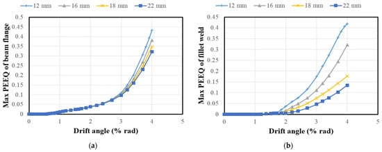 Figure 12 depicts and compares the max values of PEEQ index for four kinds of shear-tab thickness. The strength of the fillet welds between the shear tab and column face was evaluated in accordance with the 2012 AIJ steel connection design recommendations []. The shear-tab thickness was 12, 16, 18, and 22 mm. The leg sizes of fillet welds were 8, 10, 12, and 14 mm. As mentioned, the UR-connection used a total of 12 M24-S10T high-strength bolts with a 22 mm thick shear tab. In this case, the moment strength of the beam web was taken as the design demand of the shear tab. The 18 mm case considered the moment demand on the beam web. The beam web and flanges took moment in proportion to the elasticity section modulus. The 12 and 16 mm cases mainly considered shear demands. The former represented a direct weld connection and considered the shear demand on the beam. The latter took the shear strength of the beam web as the design demand of the shear tab.