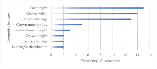 The geometric features identified in the 48 papers included in the in-depth analysis are listed in Table 2. The number of papers referring to them is seen as their frequency of occurrence and is represented visually in Figure 2. Tree height, crown width and crown coverage are three dominative geometric features considered in the 48 papers, which occur 15, 14 and 13 times, respectively. Following this is crown morphology (or crown shape). It should be mentioned that crown morphology may be equally essential with tree height despite its low frequency of occurrence. Crown coverage, crown width and crown height are often used to describe the crown morphology for convenience in the quantitative analysis.