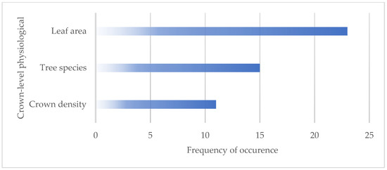 The frequency of occurrence of each crown-level physiological characteristic is illustrated in Figure 3. As LAI and LAD are both indices to describe the leaf area in the crown, the frequencies of occurrence of LAI, LAD and total leaf area are tallied together to show their significance. It could be seen that the crown-level physiological characteristics are all high-frequency characteristics in the 48 papers included in the in-depth analysis, which shows their high degree of attention and their significant role in trees’ function in urban microclimate regulation [51,53,55,56,58,59,60,63,69,71,73,84,85,86,87,88,89,90].