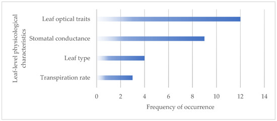 Leaf-level physiological characteristics encompass very detailed information about leaves, including leaf type, transpiration rate, stomatal conductance and leaf optical traits. Table 4 lists the leaf-level physiological characteristics and the literature mentioning them, while Figure 4 gives the frequency of occurrence of each leaf-level physiological characteristic.