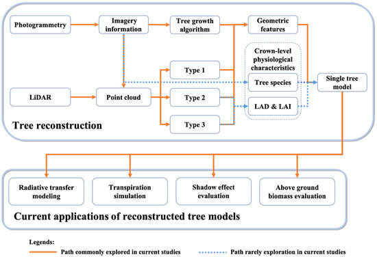 The first column of Table 6 shows the data sources for tree reconstruction. In summary, there are two technologies, namely photogrammetry and LiDAR to obtain point clouds. Photogrammetry relies on a multiple overlapping images and information about their internal and external orientation parameters, image overlap, etc. These images can be a sequence of overlapping images taken as the platform moves, or the multi-view images taken from different positions. Through an image-matching algorithms such as structure from motion (SfM) or multi-view stereophotogrammetry, it is possible to generate photogrammetric point clouds.