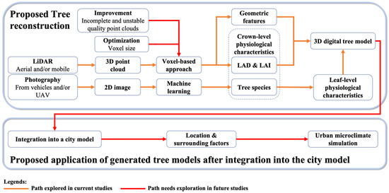 Urban trees play one of the most significant roles in regulating the urban microclimate, along with bushes and green spaces, which can be taken as a simpler form of “trees” in the reconstruction process. However, the association of urban microclimate simulation and tree reconstruction has hardly been considered comprehensively in prior studies, although some tree models have been used for a particular part of the microclimate, e.g., radiative transfer modeling [39,40,41,42], transpiration simulation [43], shadow effect evaluation [44], etc.