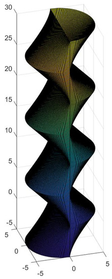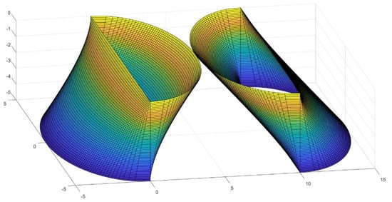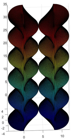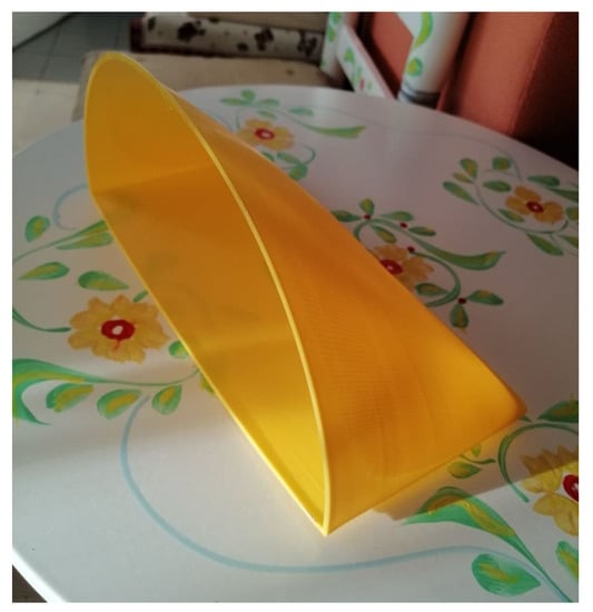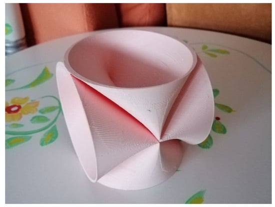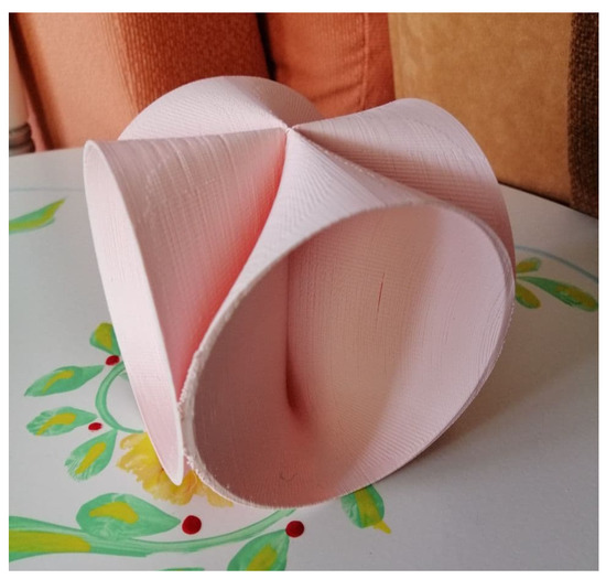 So far, we have presented scientific design developments that we hope will find a myriad of applications in technological areas such as Nautical, Aerospace, Building, Heritage, Retrofit and associated industries or machinery. Such facts attest to the versatility and feasibility of the solutions presented, which derive from our mathematical investigation. In the last part of the research, due to their complexity, the surfaces have been materialized with the help of 3D fabrication procedures to help decide about some difficult points of the equations or to reflect on future realizations of the proposals. It is undeniable for us that the results attain to the domains of Art and Design (Figure 33, Figure 34, Figure 35 and Figure 36). They have been included in the study, as they constitute a veritable revolution of forms.