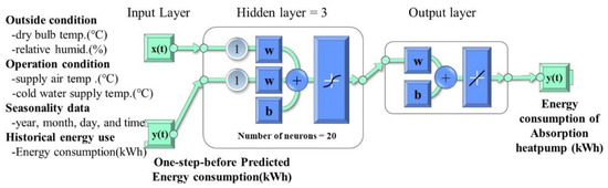 This research team has been continuously conducting research into various prediction methods related to the operation of air conditioning equipment through machine learning. For example, ref. [18] investigated a study of heat pump energy consumption predictions using an ANN model and found that the CvRMSE of 19.49% in the training period and 22.83% in the testing period satisfy the ASHRAE standard. In another study of cooling load predictions using MATLAB’s NARX (with eXogenous) feedforward neural networks model, ref. [19] confirmed the prediction performance with a CvRMSE of 7% or less. In yet another study, the energy consumption of the air handling unit and the absorption heat pump during the cooling period was predicted using the ANN model. Both the air handling unit and the absorption heat pump prediction models obtained results satisfying ASHRAE guidelines. Through these research results, it was reaffirmed that the artificial neural network-based prediction model could obtain relatively high accuracy prediction results with only a sufficient amount of data [20].