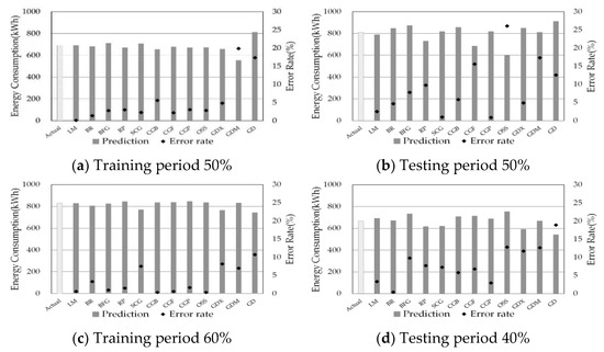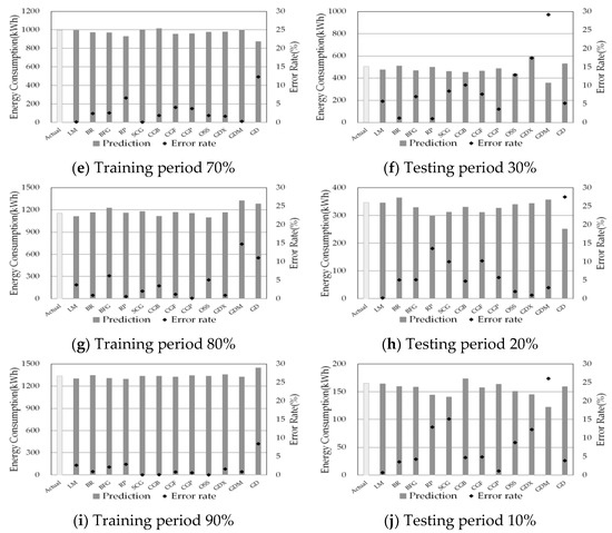 Figure 3 summarizes the prediction results according to the sizes of training and test data. In the training period, most models showed satisfactory error rates under all conditions. However, GDM and GD models showed slightly higher error rates of 14.75% and 11.01%, respectively, when the training sizes were 50%, 17.33%, and 70%, GD 12.30%, and 80%, respectively.