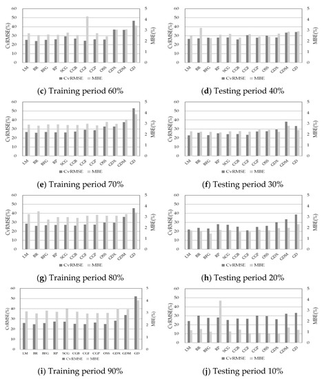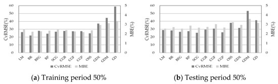 Figure 4 summarizes the CvRMSE and MBE prediction results according to the size of training and test data. The CvRMSE of most models satisfies ASHRAE guideline 14 with less than 30% in the training period and testing period. However, GDM and GD did not meet the criteria by more than 30% under all conditions. In addition, CGF (testing period 50%), OSS (training period 70%/testing period 50%), and GDX(training period 50%, 60%, 70%/testing period 50%) did not meet the criteria under some conditions. The MBE of all models was 5% or less, showing that ASHRAE guideline 14 was satisfied.