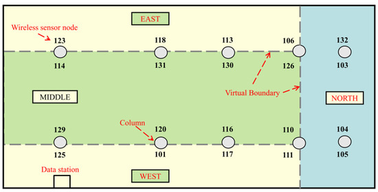 The dimension of the large space is 54 × 27 × 4.5 m3, which is a typical indoor large space building. The HVAC system used in this area is the most common Variable Air Volume (VAV) air conditioning system. The WSN test-bed consists of 20 wireless sensor nodes, a receiver device, and a desktop computer for storing and processing data. The 20 wireless sensor nodes were installed on 10 pillars, with two wireless sensor nodes installed on each pillar. Each wireless sensor node is 2 m above the ground and distinguished by a unique number. The layout of the WSN network-based monitoring platform is shown in Figure 1 as well. Since the space belongs to the inner area of the building and has a large area, the indoor space is divided into four subzones based on its functional, the air conditioning configuration and other factors: East, West, North and Middle. The East, West and North subzones are aisle areas and the Middle zone is a temporary study area. It is noted that the boundary between each subzone is defined as virtual boundary without any physical partitions.