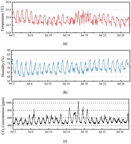 Temperature, Humidity and CO2 concentration profile in July (No. 113): (a) Temperature profile; (b) Humidity profile; (c) CO2 concentration profile.