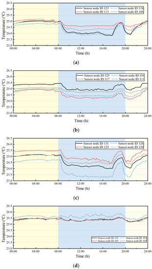 Figure 3 shows the temperature change of 16 sensor nodes in the four subzones of the space during one specific day, it reveals that the large space has uneven temperature distribution and local overcooling (lower than the set-point temperature 24.5 °C). The temperature gradually decreases to the temperature set point after the air-conditioning had been switched on at around 8:00 in the morning. It is interesting that the temperature has a significant fluctuation from 6:00 p.m. to 8:00 p.m., mainly because this space is a concourse and temporary area for study, there are a lot of moving students during this period of time, in addition, local students prefer to stay longer.