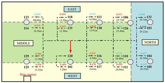 Each temperature measurement time-series from each sensor node in the WSN can be considered as an independent variable, and the correlation coefficients between each other can be calculated using Pearson’s formula. We select node 120 as the study target because it had less data missing, which can help make data reconstruction easier compared with the site measurement data. The correlation coefficient between the remaining 19 wireless sensors and this sensor is calculated to form a correlation coefficient linkage graph for this node, as shown in Figure 4. The data above the horizontal line in Figure 4 indicates the correlation coefficient between a sensor node and sensor node 120, and the ones below the horizontal line indicates the linear distance from sensor node 120. For example, the correlation coefficient between node 123 and node 120 is 0.629, and the line-of-sight distance is 19.09 m. Figure 4 illustrates that: (1) a total of 11 sensor nodes are highly correlated (|r| ≥ 0.8) with node 120, 7 sensor nodes are moderately correlated (0.5 ≤ |r| < 0.8) with node 120, and 1 sensor node is lowly correlated with node 120 (0.3 ≤ |r| < 0.5), which indicates that the correlation between node 120 and other sensors is relatively close. (2) The sensor nodes with strong correlation with node 120 have a certain pattern in terms of distance. The closer the node is to node 120 in terms of linear distance, the more likely it is to be highly correlated, and the farther the node is to node 120 in terms of linear distance, the more likely it is to be moderately or lowly correlated. (3) The sensor node 114 with strong correlation with node 120 is not closer in distance. For example, the correlation coefficient between node 114 and node 120 is larger than that between node 131 and node 120, but the line-of-sight distance between node 114 and node 120 is 18.26 m, and the line-of-sight distance between node 131 and node 120 is 12.30 m. It should be noted that the correlation coefficient of each node in the figure varies with the calculated data, and the correlation coefficient of each node will be different.