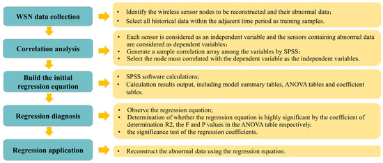 In this study, multiple linear regression analysis was performed using SPSS software to reconstruct the abnormal data of a specific wireless sensor node. The correlation analysis between node 120 and other remaining sensors in the WSN network was performed based on the method introduced in aforementioned section. The sensor node with the higher correlation with node 120 was selected for MLR modeling, which can reduce the complexity of MLR calculation. The final regression equations for reconstructing the temperature, humidity, and CO2 concentration data were determined as follows:
