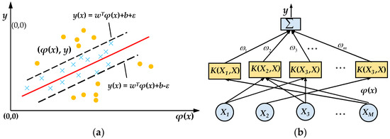 For the given a sample data D = (xi(j), y(j), i = 1, 2, …, M, j = 1, 2, …, N), xi(j) is the jth sample of the ith variable, y(j) is the corresponding output value, N is the sample capacity. The basic idea of SVR is to map the sample X to a high-dimensional feature space (as shown in Figure 6a) by a nonlinear mapping function φ(x), and to perform linear regression analysis in this feature space, and then construct the optimal decision function y(x) in Equation (7). The output of SVR is a linear combination of intermediate nodes, each of which corresponds to a support vector, and its structure is shown in Figure 6b.
