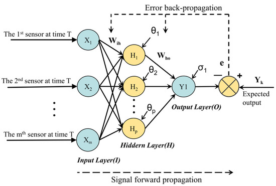 The basic structure of BP neural network based sensor data reconstruction is shown in Figure 7. Given a training set D = (xi(j), y(j), i = 1, 2, …, M, j = 1, 2, …, N), where the input layer contains m nodes, the implicit layer contains n nodes, and the output layer has one node. Wih (i = 1, 2, …, m; h = 1, 2, …, p) is the weight between the ith neuron in the input layer to the hth neuron in the hidden layer, and Who (h = 1, 2, …, p; o = 1) is the weight from the hth neuron in the hidden layer to the oth neuron in the output layer, and θh (h = 1, 2, …, p) is the threshold of the hth neuron in the hidden layer, σ1 is the threshold of the output layer, Xi (i = 1, 2, …, m) is the I neuron of the input layer of the BP neural network, Y1 is the neuron of the output layer of the BP neural network, Yk is the expected output of the BP neural network, and e is the error between the expected output and the actual output of the BP neural network [42,43].