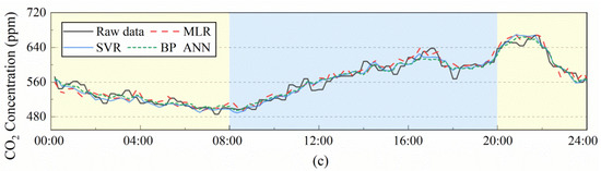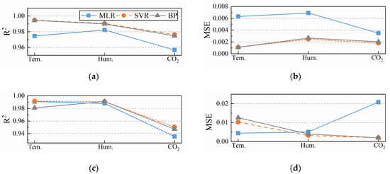 To further investigate the reconstruction accuracy of the three algorithms, R2 and Mean Square Error are selected and their formulas are given in Equations (14) and (15), where M is the total number of samples, and y(i), (i), are the ith measured data, the ith reconstructed data, and the average value of the samples, respectively. The closer the R2 is to 1 and the Mean Square Error is to 0, the better the model reconstruction is. It should be emphasized that since temperature, humidity, and CO2 concentration have different units and magnitudes. Therefore, in the procedure of data preprocessing, the three data are normalized so that they are all distributed between 0 and 1. As an example to analyze the accuracy of the three algorithms in reconstructing temperature data, Figure 10 gives the specific performance of the three algorithms in reconstructing temperature data in the training and test sets. It can be seen that the performance of each model on the training and test sets is very close to each other, with no overfitting phenomenon. The R2 based on the SVR model reconstruction is 0.9915, the MSE based on the MLR model reconstruction is 0.0044, and the R2 and MSE based on the BP neural network model reconstruction are 0.9808 and 0.0126, and their performance is the worst in comparison with other methods. The results demonstrate that the accuracy of reconstructing temperature data based on SVR model and MLR model is higher than that based on BP neural network model. It has different performance in reconstructing temperature, humidity and CO2 with exactly same algorithm, Figure 10c shows the accuracy of reconstructing the data based on BP algorithm is humidity, temperature, and CO2 concentration in order. The accuracy of reconstructing the same data based on different algorithms also varies. Figure 10d reveals the highest accuracy of reconstructing temperature data is MLR algorithm, followed by SVR and BP algorithm. Accuracy is not the only index to measure the superiority of the algorithm. From the perspectives of program complexity, computing speed and difficulty in obtaining input conditions, MLR is the most suitable one of the three methods.