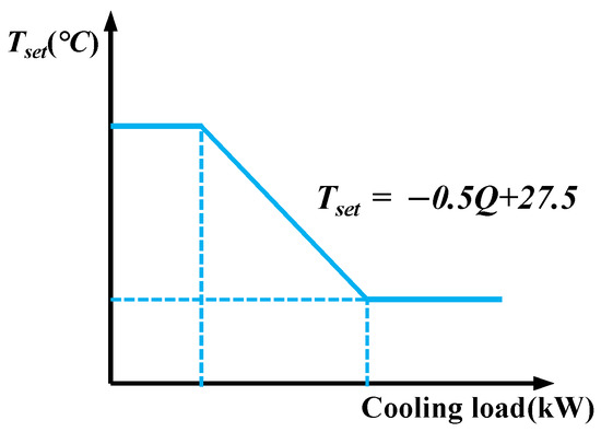 - Zonal demand control: Based on the zonal temperature control, the following two aspects were considered: (i) The relationship between room set-point temperature and room load is shown in Figure 13. The temperature set-point changes with the load, when the load is on a small scale, the temperature set-point increases appropriately, when the load exceeds a certain value, for example 2 kW, the temperature set-point decreases accordingly; (ii) the airflow coupling between virtual boundaries are considered and calculated by CONTAM program.