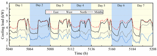 The cooling load mainly depends on the number of mobile people inside, however it is very difficult to measure indoor loads directly. Alternatively, the real cooling load for consecutive weeks of the large space can be calculated by parameters such as air supply temperature, average zonal temperature from the wireless sensor nodes, and air supply flow rate, as shown in Figure 14. Interested readers may find more information in reference [17]. According to the actual use of the air conditioner in this area, the real load calculated is from July 1 to July 7, which is equivalent to the setting time of TRNSYS software: 5040 h~5208 h. From Figure 14 it can be seen that except for the north area, the peak load is about 5.59 kW and the average load is 4.63 kW. The load in West is smaller compared with the load in East and Middle, with a maximum value of about 4.85 kW and an average load of 2.37 kW. The load in the North zone is basically the same as the load in the West zone in the morning and evening, but in daytime the load in the North zone is significantly lower than the load in the West zone since this subzone is a corridor area with people rarely stay. The load change curve basically reflects the obvious characteristic of uneven distribution of the load in large spaces. Using the measured load in Figure 14 as input, the air conditioning system of the above three control strategies was modeled and controlled with TRNSYS and CONTAM program respectively.