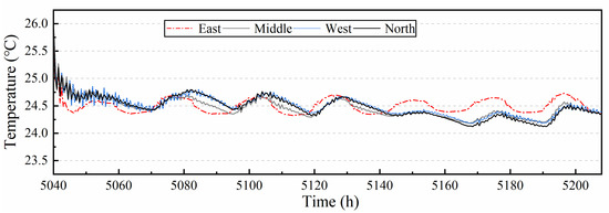 The zonal temperature control is shown in Figure 16 with four subzones has the same temperature set-point 24.5 °C. The temperature of all four subzones fluctuates between 24.25 °C and 24.9 °C. The temperature in four subzones is controlled well, and the overheating and overcooling phenomena was eliminated. From the simulation results, it can be seen that the independent control of zoning can solve the problem of overcooling and overheating in the virtual zones. Although the indoor thermal comfort is improved, the independent zonal control is not necessarily energy-saving, especially when the load in the area is smaller than other areas, the fan energy consumption can be reduced by appropriately increasing the set-point temperature. Furthermore, in TRNSYS, the division of this space is separated and seemed to be the solid walls, while the actual division of the space is without physical partitions, the air exchange between subzones should be taken into account since it can interfere the temperature control, thus the simulation conducted here is inconsistent with the reality.