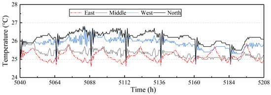 Temperature curve within 4 subzones for a specific day (8th July): (a) West subzone; (b) East subzone; (c) Middle subzone; (d) North subzone.