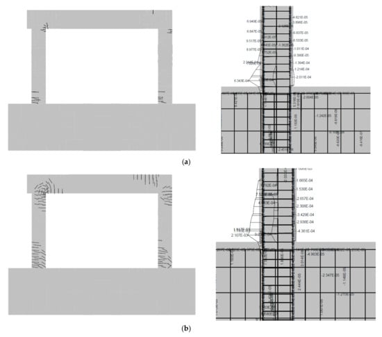 Before we utilize the results of the FE simulation for assessing the damage state of the example reinforced concrete frame, first, we need to validate them with the experimental results. Structural response of the model building obtained from FE modeling is presented in Figure 4, together with the experimental result of Kakaletsis. Generally, the FE model gives a very close load-displacement behavior to that of the Kakaletsis. The similarity of the curves suggests that many engineering parameters that can be deduced from the two curves are comparable. The global structural responses of the model structure indicate ductile failure modes; even though the maximum displacement of the FE model is slightly lower than the experimental result. The cracks intensities and their corresponding positions that occur at failure is also comparable to that of Kakaletsis’s experiment (see Figure 5). The similarity can indicate the same failure mechanism between the FE model and Kakaletsis’s experiment.