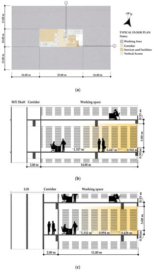 (a) Typical floor plan, (b) long section view, and (c) short section view of the office space.