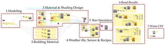 The Grasshopper definition and its main simulation workflow in this study is depicted in Figure 3. In general, the simulation definition in this study consists of seven main parts. The first part is the modelling, where the Grasshopper parameters take input from Rhinoceros geometry and convert them into the Honeybee model. The second part is the setting for building materials, which for this case is shown later in Table 2. The third part is modelling and setting parameters for the shading devices. This step is omitted for the baseline scenario, since the shading devices are not applicable. The fourth part is defining the parameters and components for selecting the weather file, sensor and defining the simulation recipe. The fifth part is assigning the component to run the simulation. In the sixth part, after the simulation finishes, the results are read, and the data are finally exported into a CSV file in the seventh part for further analysis. More detailed explanations considering specific simulation requirements and procedures are provided in the following subsection.