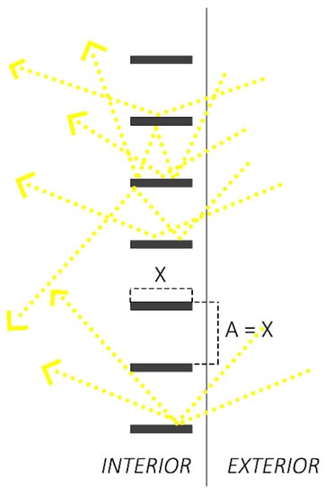 In the fixed shading design option, horizontal shading devices (venetian blinds) are introduced on the internal side of the façades. The default material of the slats is metal with a reflectance of 0.5 and a specularity of 0.9. The simulation is conducted by varying the width of the slats, as well as the distance between the adjacent slat rows (Figure 5), assuming a constant, net opening height of 3 m (cf. Figure 2). The required number of slats for each façade in zone is then reported, which is equal to 8.75 m divided by the slat width, rounded to the nearest integer value.