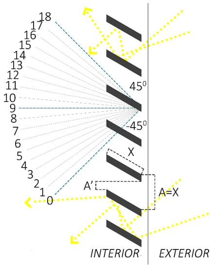 In the adaptive shading design option, the horizontal shading devices are modelled with adaptive properties in terms of varying slat angles, responding to the daylighting condition, which is represented with the indoor illuminance. In this design option, the slat angles are varied simultaneously within the range of −45° to 45° with a step of 5° (Figure 6). The slats are thus never entirely closed (90° angle), but are only half open, either up or down.