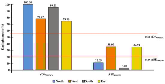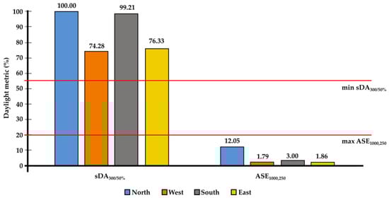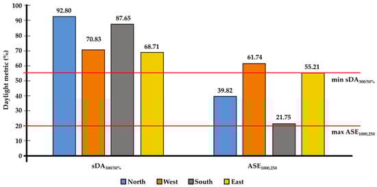 Simulation results of the baseline scenario (without any shading devices) is displayed in Figure 7, for all sampled zones. It is observed that sDA300/50% in almost all cases have satisfied the criterion (≥55%), while all ASE1000,250 values exceed the maximum target of 20%.