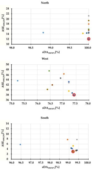The scatter plots of the partial sDA300/50% and ASE1000,250 due to slat angle variations in all scenarios, respectively for the east and west zones, are displayed in Figure 13 and Figure 14.