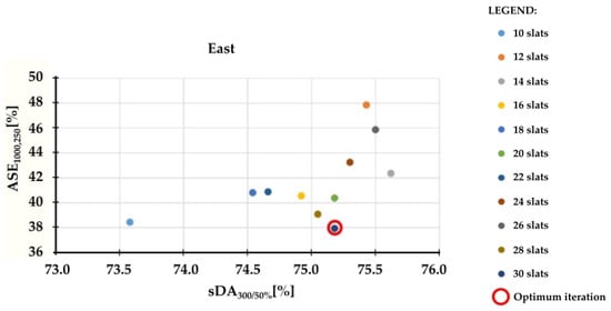 The iteration results are shown by the scatter plots in Figure 8, which indicate that the number of slats may result in a wide range of ASE1000,250, up to approximately 10% in most orientations. However, the number of slats seems to only slightly affect the sDA300/50%.