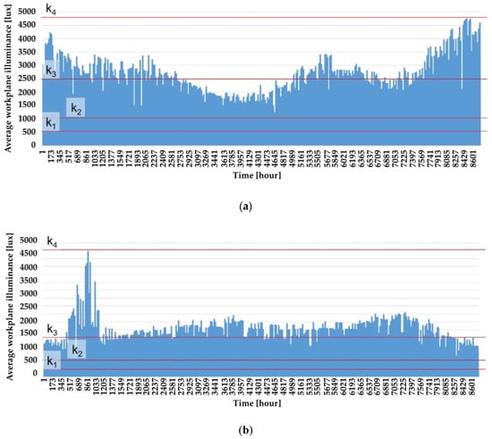 Time series of the average workplane illuminance in the (a) east and (b) west zones, and the resulting scenarios k1 until k4.