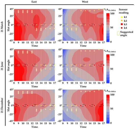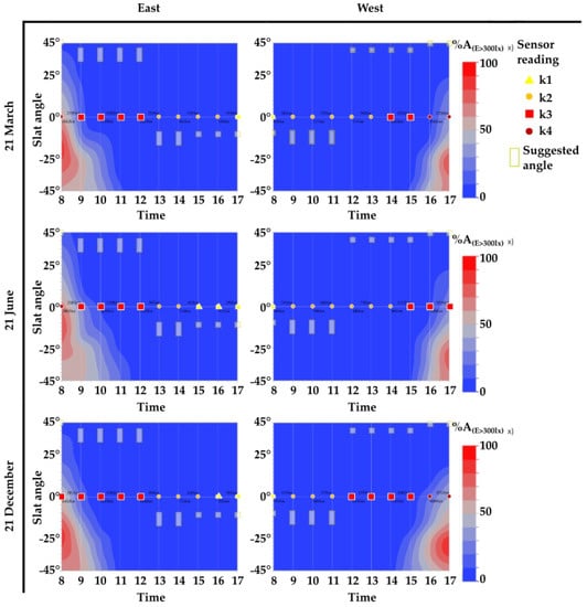 The relations between the slat angle and time with respect to sDA300/50% in the east and west zones on the three critical days are displayed in Figure 11, while those with respect to ASE1000,250 are displayed in Figure 12. Both figures suggest that in the east zone, scenario k4 applies in the beginning of the day (8.00 h) on 21 March and 21 June, and practically all parts of the zones have exceeded the workplane illuminance of 300 lx. Scenario k3 applies from 9.00 h, or from 8.00 h on 21 December, until noon. From noon until the end of the working day, scenario k2 or k1 applies. The opposite trend applies to the west zone, in which scenarios k1, k2, k3, k4 apply in that order as the day goes by.