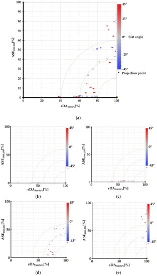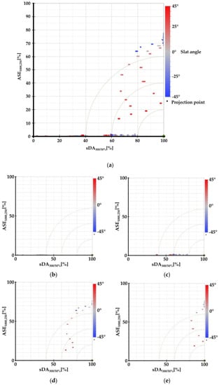 Scatter plots of the sDA300/50% and ASE1000,250 due to slat angle variation in the east zone, for (a) all scenarios, (b) scenario k1, (c) k2, (d) k3, (e) k4.