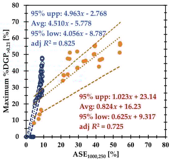 Regression model of the maximum %DGP>0.21 with respect to ASE1000,250, based on data from reference [55].