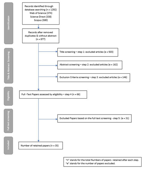 Subsequently, we removed duplicates (e = 415). Then, we performed title and abstract screening. Step 1 excluded all the papers whose title was not relevant to the scope and objectives of this study (e = 503). Step 2 excluded all the papers without an abstract or whose abstract was not relevant to the scope and objectives of this study (e = 162). Finally, step 3 excluded all the papers according to the outlined inclusion and exclusion criteria (e = 146) as mentioned in the previous paragraph. Next, the full texts of the remaining 66 papers were read, assessed, and fitted on the scope of the research. Thirty-one papers were excluded, given that they did not use ML or statistical techniques. Finally, the remaining 35 papers were considered eligible for further analysis. Thirty-three were published in scientific journals, whereas two were published in conference proceedings.